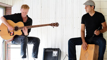 Mit ihrem neuen Programm „One World One Voice“ ist das Duo „sounds from wood“ 2024 unterwegs; Groove Pop-Standards im Jazzgewand. Mit einem Bass, einem Looper und brasilianischer Perkussion erschaffen die beiden Musiker wellenartige, aufschäumende, plätschernde und berauschende Musik. Heiko Eulen am akustischen Bass oder 8-string Bass bezieht sich mit seinem Funk-Stil und den Blues betonten Linien auf seine Vorbilder. Seit seiner Kindheit ist er begeistert von der musikalischen Kraft eines Jaco Pastorius´ oder Keith Richards´. Rui Reis (Bahia, BRA) ist am Meer aufgewachsen. So ist bei ihm der Rhythmus zum Sonnenuntergang bis in die Fingerspitzen zu spüren. Mit Cajon und Pandeiro (Rahmentrommel) bewegt er sich wie ein Fisch im Wasser. Ein Könner an den Percussion-Instrumenten.