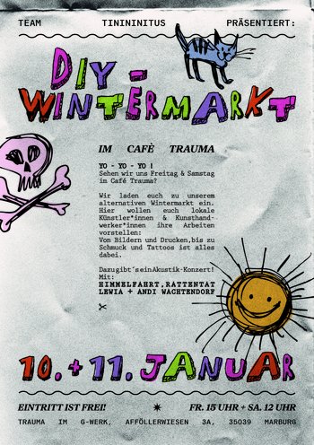 Team Tinnitus präsentiert: DIY WINTERMARKTFr. / 10.01. / 15 UhrSa / 11.01. / 12 Uhr Yo-Yo-Yo!Sehen wir uns Freitag & Samstag im Café Trauma? Wir laden euch zu unserem alternativen Wintermarkt ein. Hier wollen euch lokale Künstler*innen & Kunsthandwerker*innen ihre Arbeiten vorstellen: Von Bildern und Drucken, bis zu Schmuck und Tattoos ist alles dabei. Dazu gibt´s Samstag Abend ein Akustik-Konzert !Mit: @himmelfart_band @rattentat @lewia.musik @wachtendorf_musik Das Café Trauma ist nur bedingt barrierefrei.Wendet euch gerne an uns. Es gibt ein rollstuhlgerechtes WC und eine Rampe zum Saal am Hintereingang.Wir lehnen Queer-Feindlichkeit, Sexismus, Rassismus, Antisemitismus, Ableismus sowie sonstige gruppenbezogene Menschenfeindlichkeit ab.Wir möchten gemeinsam einen diskriminierungsarmen Raum erschaffen. Achtet auf euch und andere und sprecht uns bei Konflikten an.Poster: @phine_dsgn