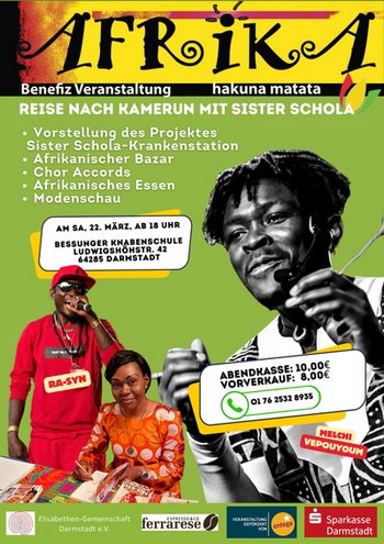 Benefiz-Veranstaltung für das GesundheitszentrumDer Afrika-Abend findet seit langen Jahren in der Knabenschule zu Gunsten des SisterSchola-Gesundheitszentrum in Mbalmayo/Kamerun statt. Sister SCHOLA hat wieder ein buntes Programm zusammengestellt.Afrikanischer Basar, afrikanische Modenschau, afrikanische Delikatessen, Informationen zum Projekt Dazu ein Bühnenprogramm mit Musik und Tänzen und dem französischen Chor accords.