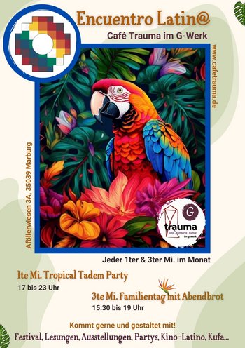 Unsere erste Motivation ist der kulturelle Austausch und das Führen eines Gesprächs auf Deutsch und Spanisch. Mit großem Interesse daran, die Realität der Anderen interpretieren zu können. (Südamerika) Wir sind auf der Suche nach Initiativen und Projekten wie das Unsere. Oder sehr ähnlich! In unserem Kulturzentrum Trauma im G-Werk verfügen wir über die Infrastruktur, um alle Arten von Aktivitäten wie Kino, Theater, Ausstellungen, Lesungen, Kolloquien, Foren, Konzerte und Vieles mehr zu entwickeln.