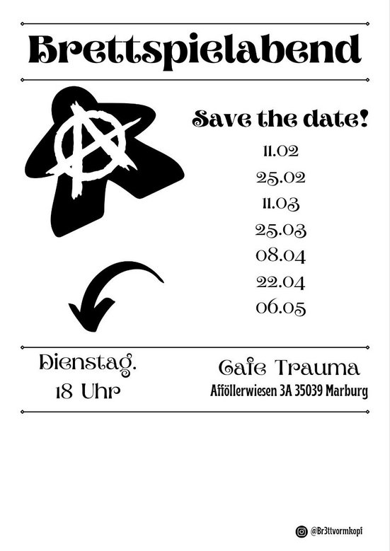 Br3ttvormkopf lädt wieder zum Spieleabend ein.Beginn: 18:00 h | Eintritt freiAlle zwei Wochen treffen wir uns Dienstags in der BaariBar um gemeinsam Brettspiele zu spielen! Bringt gerne Freund:Innen, Brettspiele & gute Laune mit !