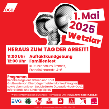 Oberbürgermeister Manfred Wagner überbringt das Grußwort für die Bebelstadt Wetzlar. Double Stroke werden das Fest musikalisch begleiten. Die Kolleg:innen von MOZAIK sind mit dabei und haben eine Überraschung parat. Damit niemand Hunger leiden muss verwöhnen die Profis von der IG BCE.