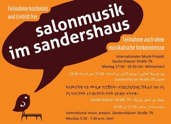 Internationales Musik-Projekt in der Sandershäuser Straße 79Jeden Montag von 17:30 bis 19:30 Uhr. Interessierte Musiker:innen, auch ohne Vorkenntnisse, sind willkommen sich regelmäßig zu treffen um gemeinsam zu Musizieren und zu Experimentieren. Verschiedene Instrumente sind vorhanden, können aber auch gerne mitgebracht werden. Die Teilnahme ist kostenlos!international music project at Sandershäuser Straße 79Starting now every Monday from 5:30 to 7:30 p.m. Interested musicians are welcome to meet weekly, make music together and find new musical perspectives. Various instruments are available. If you have your own, please bring it. ابتداء من الآن, جميع الأشخاص المهتمين بالموسيقى مدعون أسبوعياً يوم الإثنين من الساعة 5:30 حتى الساعة 7:30 للالتقاء وعزف الموسيقى سوياً بالإضافة لإيجاد أنماط موسيقية جديدة. تتوفر آلات موسيقية مختلفة كما يمكنكم احضار آلاتكم الخاصة معكم.Kontakt:Oliver Leuer (musikalischer Leiter) 4ol@gmx.deKulturfabik Salzmann, Telefon: 0561 - 57 25 42