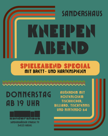 Wir haben Lust, mit euch zusammen bei Karten- und Brettspielen den Abend zu verbringen. In unserer großen Spielesammlung ist für alle Geschmäcker was dabei. Setzt euch doch einfach dazu und kommt bei einer Runde eures Lieblingsspiel ins Gespräch. Parallel dazu läuft unser Kneipenabend wie jeden Donnerstag weiter. Zwischen lecker-günstigen Getränken und entspannter Barmusik könnt ihr kostenlos Billard, N64 und Kicker oder im Nebenraum auch Tischtennis spielen.