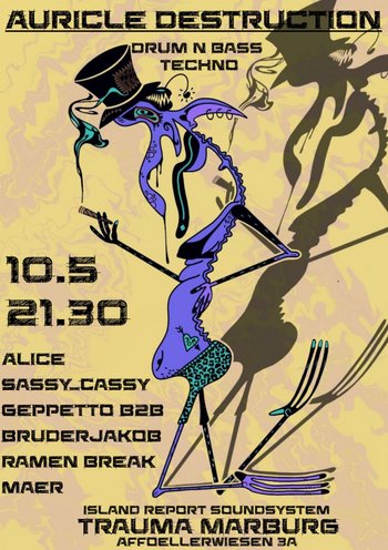 Auricle destruction XIIIBevor der Sommer und die Outdoor Saison losgehen wollen wir mit euch zusammen uns nochmal ordentlich vom Soundsystem durchschütteln lassen und zu Acid Techno, Trance und Drum n Bass abdancen.Packt eure Friends und gute Laune ein und kommt vorbei!Specials wie Altbier Bowle und Wassereis gibt's natürlich auch wieder.Support your local Scene and Artist! Line Up:Alice ( Hardtechno / Gießen )Sassy Cassy (Trance / Lollar)Ramen Break (Drum n Bass / Dnb Station / Auricle Destruction)Geppetto B2B Bruder Jakob ( Psychedelic Techno / Auricle Destruction)Maër ( Techno / Auricle Destruction / Vinyl only )Datum: 10.5.25Einlass: 21.30Eintritt: ab 5 EuroGehörschutz umsonstAwareness Team vor Ort Das Café Trauma ist nur bedingt barrierefrei. Wendet euch gerne an uns. Es gibt ein rollstuhlgerechtes WC und eine Rampe zum Saal am Hintereingang.Wir lehnen Queer-Feindlichkeit, Sexismus, Rassismus, Antisemitismus, Ableismus sowie sonstige gruppenbezogene Menschenfeindlichkeit ab. Wir möchten gemeinsam einen diskriminierungsarmen Raum erschaffen. Achtet auf euch und andere und sprecht uns bei Konflikten an.