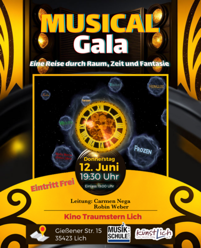 Am Donnerstag, den 12. Juni 2025, lädt die Musikschule Lich e.V. zusammen mit KünstLich e.V. zu einem besonderen Event ins Kino Traumstern ein. Unter der Leitung von Carmen Nega und Robin Weber führen Schüler der Musikschule Lich e.V. sowie externe Sänger/innen in einer Gala-Veranstaltung die größten Hits aus 70 Jahren Musical-Geschichte auf.