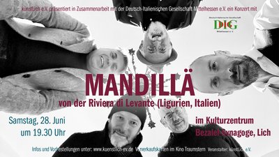 Exklusiv für zwei Konzerte in Wetzlar und Lich kommt die Folk-Jazz-Pop-Mundart-Gruppe „Mandillä“ (gesprochen: Mandilla) von der Riviera di Levante (Ligurien, Italien) zu uns, auf Einladung der Deutsch-Italienischen Gesellschaft Mittelhessen e.V.. Die fünfköpfige Formation, die 2008 gegründet wurde, ist vor allem in ihrer Heimat sehr bekannt und hat eine Reihe von Preisen bei regionalen Festivals gewonnen. Der Bandname „Mandillä“ ist ein Dialektbegriff und bedeutet so viel wie „Taschendiebe“. Es greift eine Wendung des berühmten Genueser Cantautore (Liedermacher/ Singer-Songwriter) Fabrizio de André auf: „Facce da mandillä“, die in einem von dessen bekanntesten Liedern vorkommt: „Creuza de Mä“.