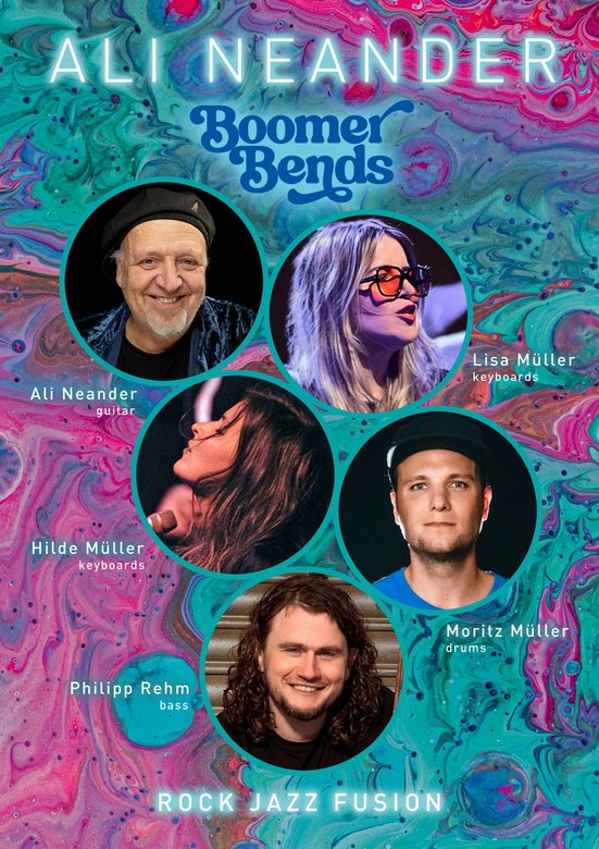 Ali Neander, Gitarre, Gründungsmitglied der Rodgau Monotones, Sideman bei Moses Pelham, Edo Zanki, Glashaus, dem Rilke Projekt und vielen mehr hat sich für sein neues Projekt „Boomer Bends“ mit Super-Drummer Moritz Müller (Heavytones, The Intersphere) und den ebenso phantastischen Philipp Rehm am Bass und Hilde Müller an den Keyboards zusammengetan für Konzerte voller mitreißender Instrumentalmusik zwischen Rock, Funk, Prog und Jazz. Atmosphärische Passagen, virtuoses Zusammenspiel und Killer-Grooves stehen im Mittelpunkt. Es werden Stücke von Neanders aktueller CD „Boomer Bends“ zu hören sein, aber auch die anderen kommen kompositorisch zum Zuge. Ein Fusionsspektakel der Extraklasse.