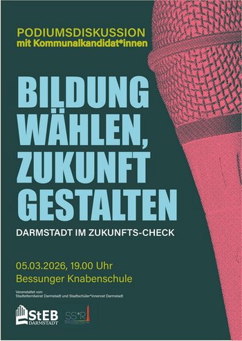 Im Vorfeld der hessischen Kommunalwahl am 15. März lädt der Stadtelternbeirat Darmstadt gemeinsam mit dem StadtschülerInnenrat Darmstadt zu einer öffentlichen Podiumsdiskussion ein. Unter dem Titel „Bildung wählen, Zukunft gestalten – Darmstadt im Zukunftscheck“ diskutieren die Spitzenkandidatinnen und -kandidaten der aktuell sechs stärksten Parteien in der Darmstädter Stadtverordentenversammlung (Bündnis 90/Grüne, CDU, SPD, Volt, UFFBASSE, Die Linke) über zentrale bildungspolitische Fragen und Perspektiven für die Kommune. Die Veranstaltung beginnt am 5. März um 19:00 Uhr in der Halle der Knabenschule. Interessierte Öffentlichkeit und Presse sind herzlich eingeladen.