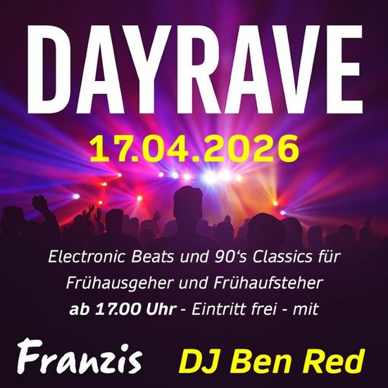 Feierabend Rave - Für Frühaufsteher und Frühausgeher! Lust auf ein bisschen Tanzen und Feiern zum Feierabend? Das geht, mit ravigen Beats von DJ Ben Red ab 17 Uhr. Schluss ist um 22 Uhr, damit ihr am Wochenende noch fit seid für andere Sachen.