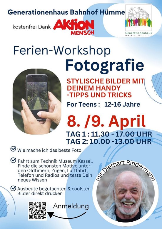 Kostenfreier Foto-Workshop in den Osterferien Dank Aktion Mensch und dem Generationenhaus Bahnhof Hümme! Am 08. und 09. April dürfen Teens von 12 – 16 Jahren mit Diethart Rindermann eine Reise in die Welt der Fotografie mit dem eigenen Handy machen und wichtige Tipps und Tricks mitnehmen für stylische Bilder. Wie entsteht das beste Foto? Welche App eignet sich dazu und wie kann ich diese bestmöglich anwenden? Am ersten Tag (11.30 -17.00 Uhr) geht es nach dem Erhalt der wichtigsten Informationen und dem Herunterladen der App (kostenfreie Variante) mit dem Bus des Generationenhauses zum Technik Museum Kassel. Dort werden die schönsten Motive unter den Oldtimern, Zügen, Luftfahrt, Telefon und Radios gefunden und das neue Wissen direkt umgesetzt. Am zweiten Tag (10.00 – 13.00 Uhr) wird die Ausbeute begutachtet & die coolsten Bilder werden direkt gedruckt.