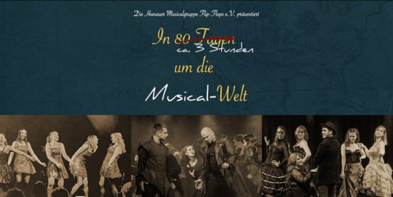Auch in diesem Jahr freut sich die Hanauer Musicalgruppe Flip-Flops e.V. darauf, das Publikum in der Show "In 80 Tagen ca. 3 Stunden um die Musical-Welt" zu begeistern! Freuen Sie sich auf einige Neuentdeckungen und auch auf unbekannte Musicals - vielleicht finden Sie an diesem Abend Ihr neues Lieblingsmusical!