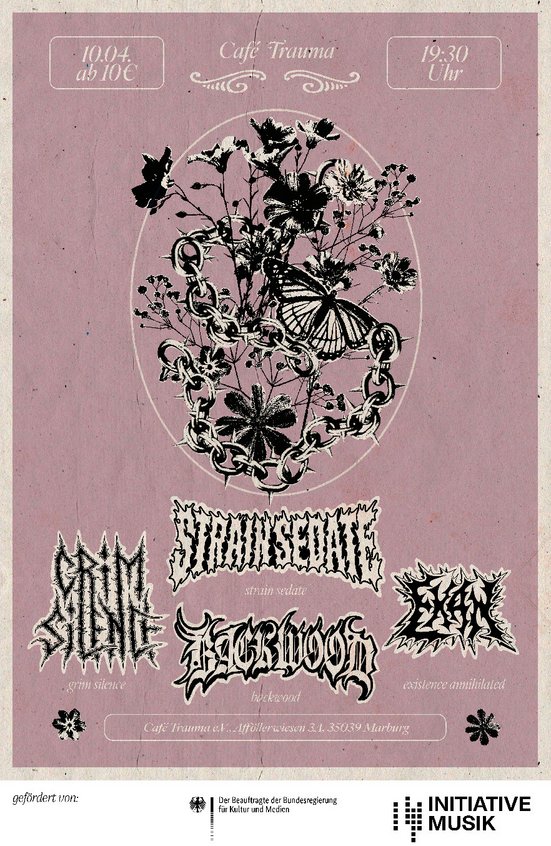 Nach Ostern machen wir uns bereit in den Frühling und ins gute Wetter zu two-steppen. Mit dabei sind Strain/Sedate aus Mannheim, Backwood aus Winterberg, sowie ExAn und Grim Silence aus Düsseldorf.