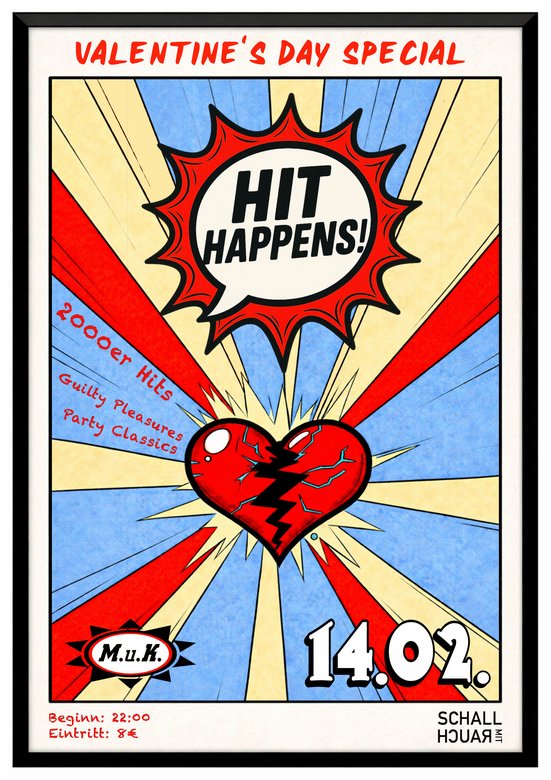 Egal ob frisch verliebt, langjährig vergeben, kompliziert, glücklich Single oder „es ist kompliziert“ –am Valentinstag passiert eins ganz sicher: Hit Happens! im MuK.