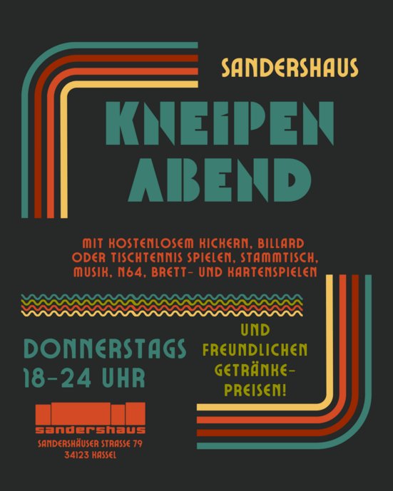 Donnerstag ist Kneipenabend! Wir laden euch jeden Donnerstag zum bunten Kneipenabend in unserer Bar ein! Zwischen lecker-günstigen Getränken und entspannter Barmusik - immer mal wieder aus den Händen lokaler DJs kredenzt - könnt ihr Billard, N64, Kicker oder im Nebenraum auch Tischtennis spielen (Rundlauf möglich!). Oder ihr nehmt Platz am Stammtisch Bettenhausen, der seit Jahren donnerstags im Sandershaus stattfindet und sich immer über neue Gesichter aus der ganzen Stadt freut. Auch Brett- und Kartenspiele stehen für euch bereit, da unser Spieleabend in den Kneipenabend integriert wird. Falls ihr donnerstags mal ohne Begleitung ausgehen wollt, werdet ihr beim Kneipenabend im Sandershaus ganz sicher und einfach mit Anderen in Kontakt kommen! Vielleicht wollt ihr auch nur ein Feierabendgetränk mit Kolleg:innen oder Freund:innen in gemütlichem Ambiente trinken? Dann seid ihr bei uns sehr willkommen!Die Bar ist von 18 - 24 Uhr geöffnet.Eintritt frei!