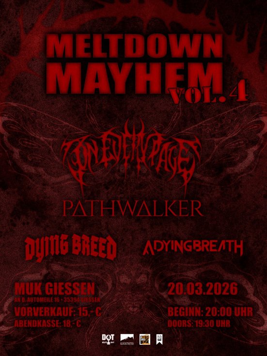 Die Vorfreude aufs neue Jahr steigt ins unermessliche! Denn wir laden euch zur vierten Ausgabe unserer Hometown-Konzertreihe MELTDOWN MAYHEM“ ein!Also schnappt euch eure Tanzschuhe, lockert die Gelenke und macht euch bereit, das Muk ordentlich aufzumischen!Mit am Start sind A Dying Breath, Pathwalker, Dying Breed und On Every Page.