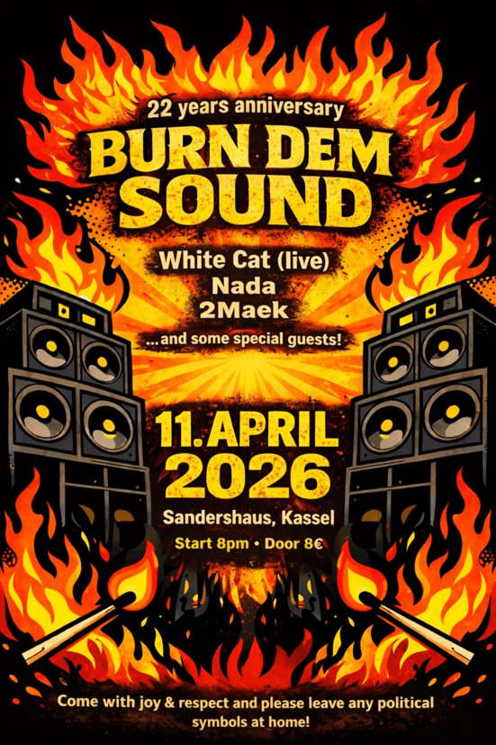 22 Jahre Burn Dem Sound – Jangezmann & Freely I presents a night full of vibes im Sandershaus! Mit 2Maek und Nada als Verstärkung an den Decks und hochkarätigen Special Guests live am Mic! Run come rally!__________________________________________________