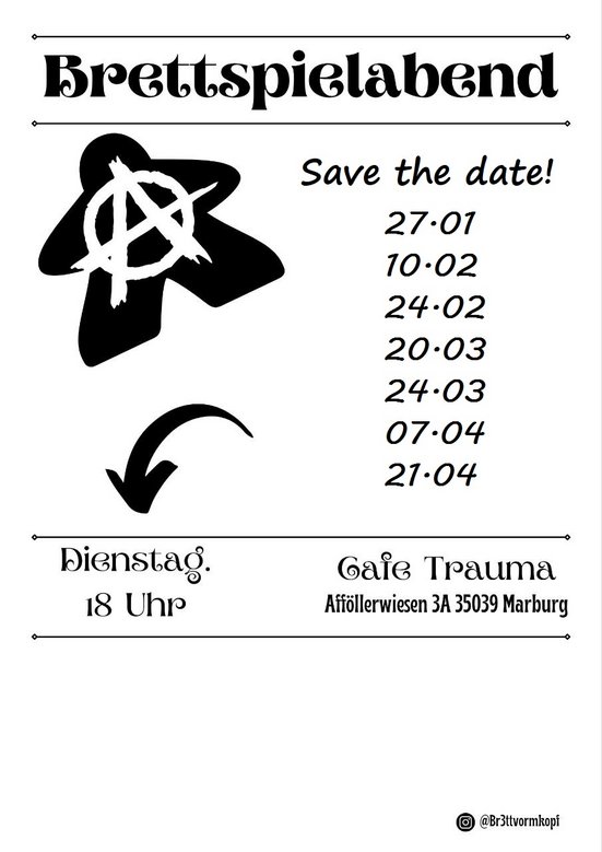 Br3ttvormkopf lädt auch am 10.02. wieder zum Spieleabend ein.Beginn: 18:00 h | Eintritt freiAlle zwei Wochen treffen wir uns Dienstags in der BaariBar um gemeinsam Brettspiele zu spielen! Bringt gerne Freund*innen, Brettspiele & gute Laune mit !