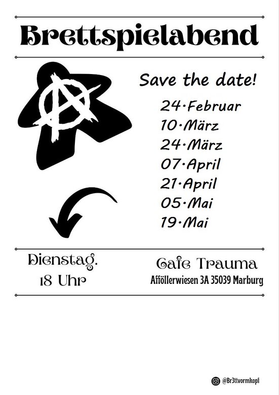 Br3ttvormkopf lädt zum Spieleabend ein.Beginn: 18:00 h | Eintritt freiAlle zwei Wochen treffen wir uns Dienstags in der BaariBar um gemeinsam Brettspiele zu spielen! Bringt gerne Freund*innen, Brettspiele & gute Laune mit.