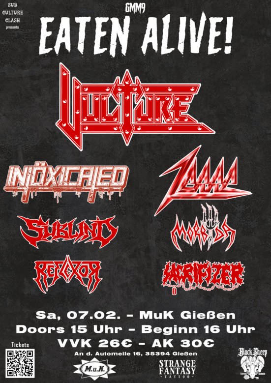Mit REFLEXOR und SACRIFIZER sind zwei heiße Eisen aus der Region am Start; mit SUBLIND aus Luxemburg, MORBYDA aus Leipzig sowie INTÖXICATED aus Osnabrück erweitern den Radius, um mit VULTURE und ZERRE europaweit bekannte Acts die Bühne abbrennen zu lassen!