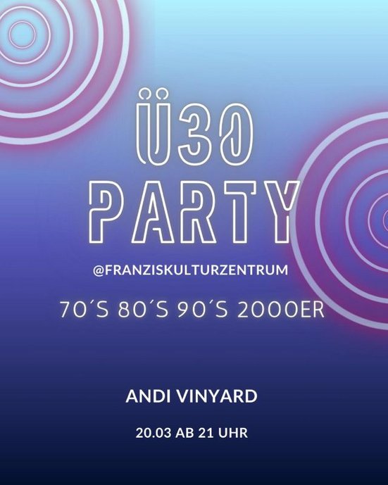 Diese Ü30-Party richtet sich an alle, die Musik lieben und das Leben feiern. DJ Andi Vinyard präsentiert die größten Hits der 70er, 80er, 90er und 2000er sowie ausgewählte aktuelle Songs, die für beste Stimmung auf der Tanzfläche sorgen. Vertraute Klassiker treffen auf moderne Sounds und schaffen einen Abend voller Energie, Wiedererkennungswert und guter Vibes.Wenn die ersten Takte erklingen und sich die Tanzfläche füllt, entsteht genau das, was eine gute Party ausmacht: Menschen, die gemeinsam abschalten, lachen und den Moment genießen. Diese Veranstaltung steht für ausgelassene Stimmung, stilvolles Feiern und eine Atmosphäre, in der man sich einfach wohlfühlt.
