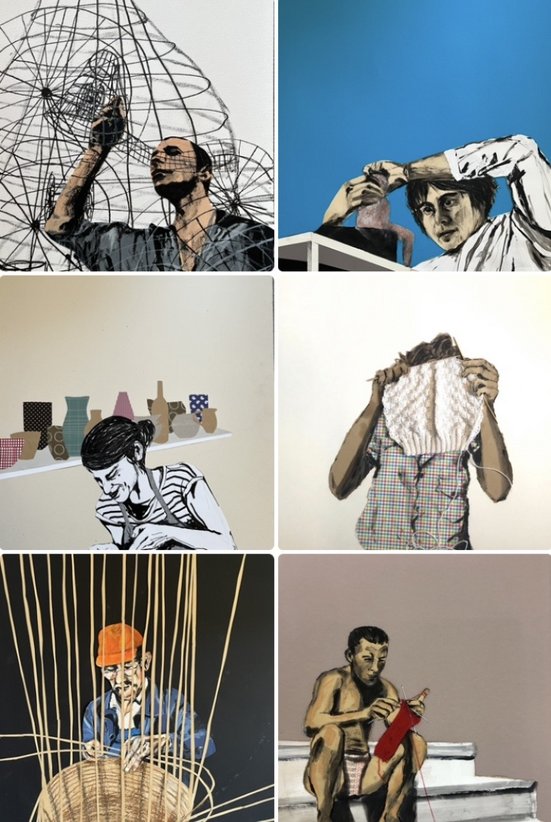 Das Thema Menschen bei der Arbeit beschäftigt Karin Fuchs schon seit langem, angefangen hat es mit Strickenden - inklusive selbstangefertigtem, aufgeklebtem Strickwerk. Aber auch Malende, Töpfernde, Korbflechtende, Spinnende, Plastizierende… begegnen Ihnen hier.